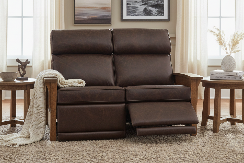 The Aldrich "wall hugger" leather reclining loveseat is available in 40 top-grain leathers and features a classic "Warm Brown" finished frame. With a comfortable 21-inch seat depth and a solid quarter-sawn white oak hardwood frame, this wall hugger leather reclining loveseat is well built and super comfortable plus it's available in both manual and power reclining options.