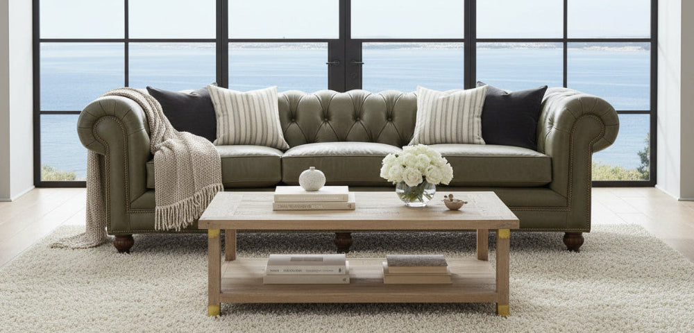 The Alfred Chesterfield button tufted leather sofa measures W112" x D41" x H34". This vintage-styled leather sofa is perfect for adding a classic touch to any living or sitting room. The warm mix of leather upholstery options bring a cozy and inviting feel to any space, while the decorative nails heads add an element of sophistication. This sofa has a robust frame that is built to last and features high-density foam cushions and 8-way hand tied springs to ensure a comfortable seating experience. The plush rolled arms and deep diamond tufting elevate the style of this piece and give it a timeless look. Whether you’re looking to create a classic atmosphere or add a touch of elegance to your home, this leather sofa is sure to be the perfect choice. Alfred features lots of decorative touches, a sturdy and true 8-way hand tied suspension with maple hardwood frame, high quality leather upholstery, and decorative antique brass or pewter nailhead trim. It is available in 40 distinct leather colors and 2 leg color options.
