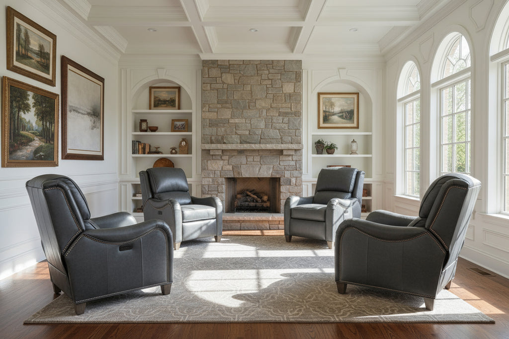 The Aster power bustle pillow back leather recliner with sleek pleated English style arms measures W35" x D41" x H43" and features multiple reclining positions (including fully reclined). Spring Down-Cushion consists of a 4 1/2 inch MARSHALL coil unit encased in premium foam. The cushion is then wrapped with a low melt fiber on top and bottom. The Spring Down cushion is then surrounded by a down-proof ticking filled with a luxurious blend of down, feathers and fibers. Aster comes standard as an E-Z Glide power recliner with a articulating headrest for that perfect sitting position. Each recliner is fully upholstered in your choice of 30 premium 100% top grain leather colors and a choice of warm brown Chestnut or Bombay Coffee Bean leg finish.
