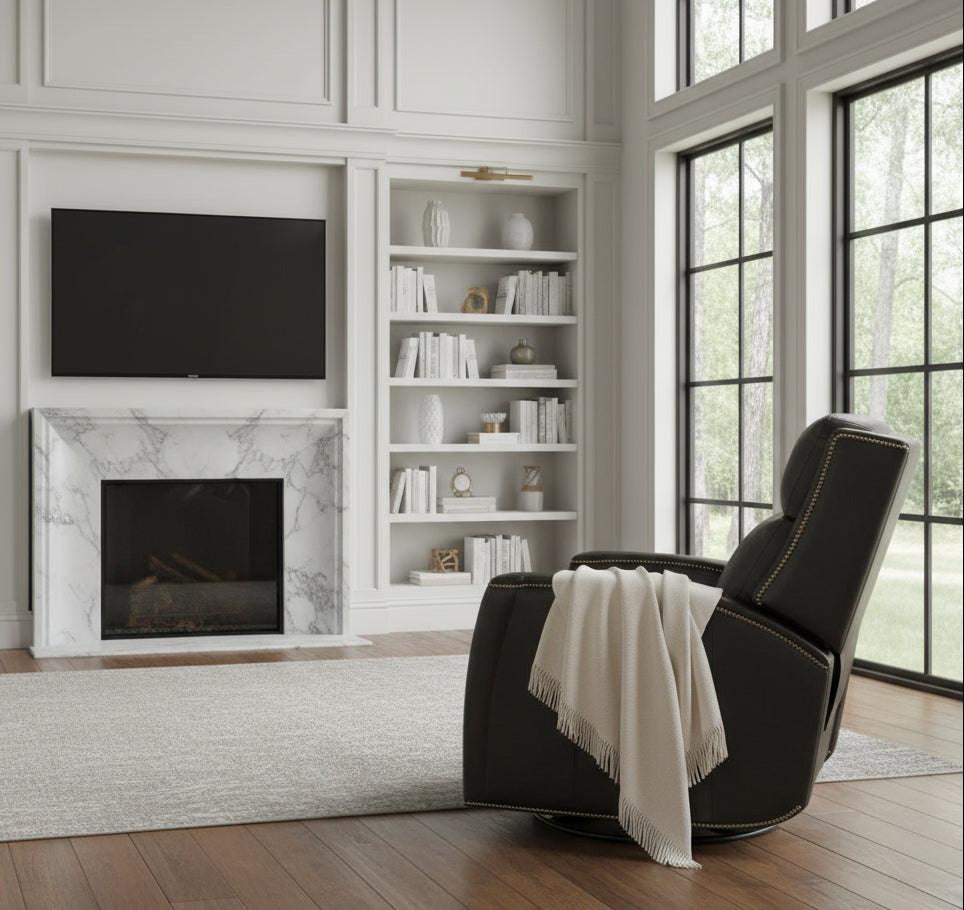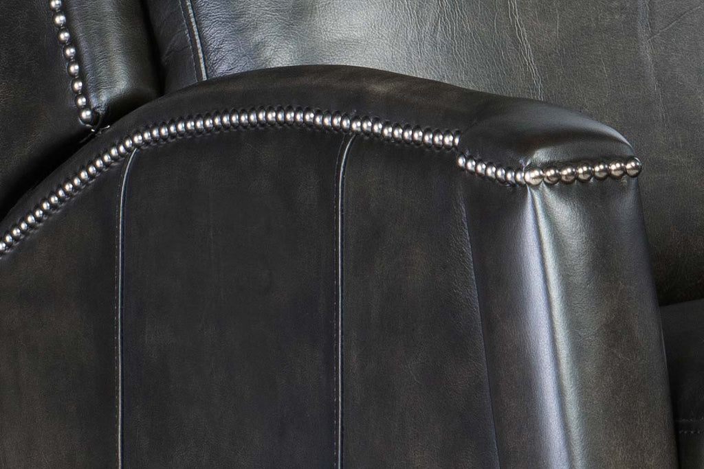 The Avalon Power "Quick Ship" transitional SWIVEL/GLIDER leather recliner chair measures W29" x D41" x H41" and features multiple reclining positions, including TV and fully reclined, with the push of a button. Depth when fully reclined is 68." This elegant, transitional leather wing-back style bustle back recliner is available in rich 100% top grain Epic Brindisi Trinita leather (as shown) and vintage hand applied nails (all pictured). This ready to ship leather club chair recliner is ideal for any room in your home. Transitional design, smaller scale, hand-crafted comfort and plush fiber wrapped seating.