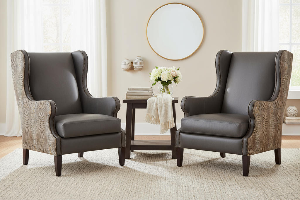 The traditional Baylor "Ready To Ship" faux Croc wing back leather accent chair measures W30" x D38" x H44" and features a sturdy hardwood frame, rich Epic Heaven Long Road leather interior with exposed Faux Croc leather exterior, vintage hand applied antique brass nails, tight in-back and set back decorative shaped arms, Bombay finished exposed legs and a plush 22 inch seat depth.