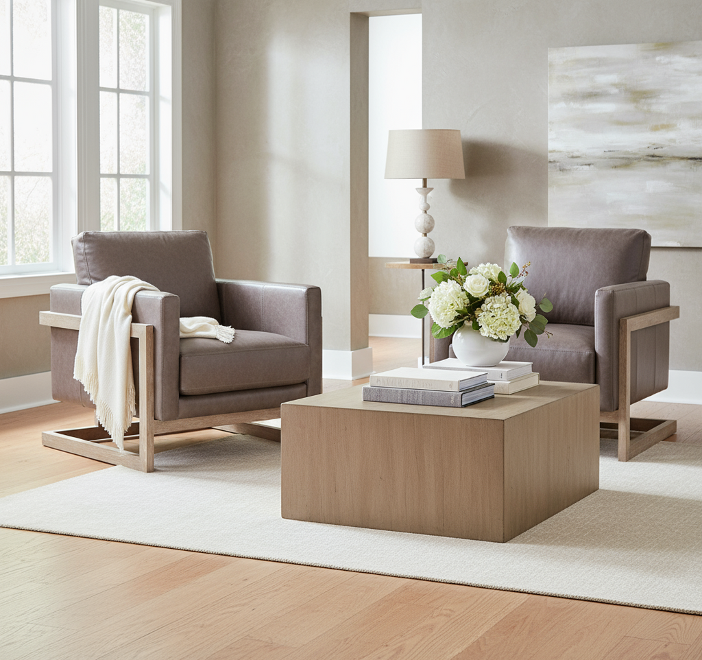 The transitional Blake "Ready To Ship" Leather Accent Chair measures W30" x D32" x H33" and features a sturdy kiln dried hardwood frame, down / feather wrapped seat cushion, rich "Luxe Parrot Grey" top grain leather (As Shown) with exposed gray washed wooden framing that trim the frame base. A stylish box boarder back cushion with saddle stitching sits inside the arms for a modern flair.
