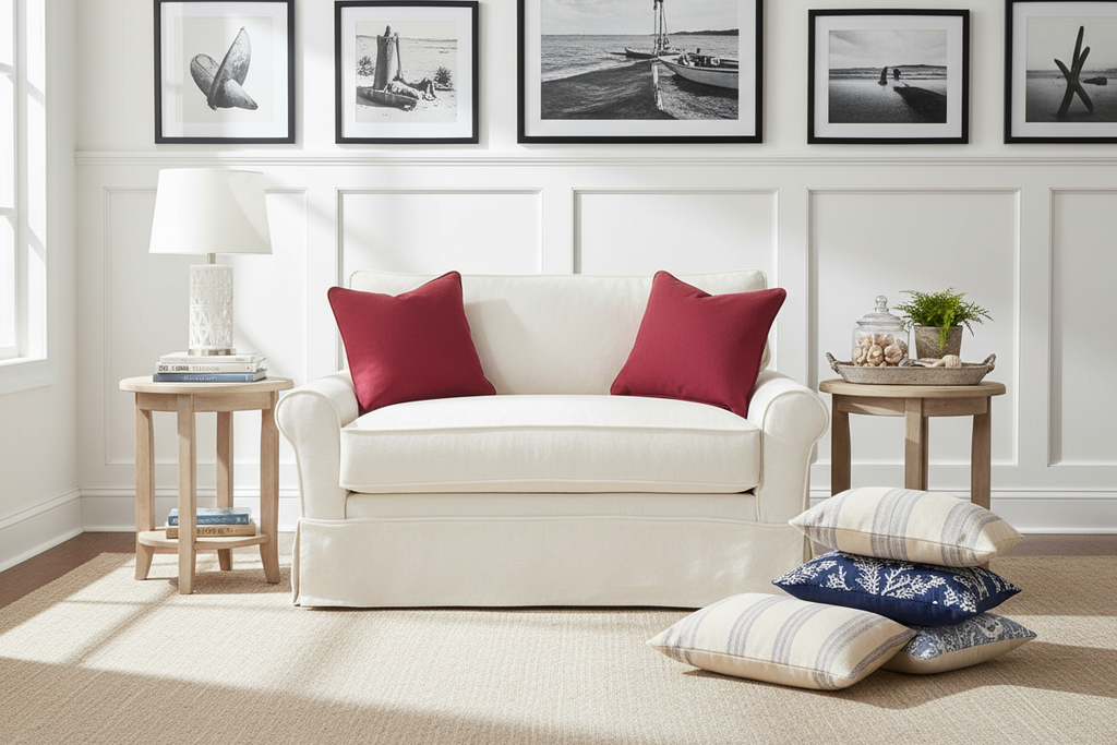 The Brigid chair and a half is a twin slipcovered sleeper sofa measures W58" x D38" x H37"offering a place to relax and a place for guest to sleep. Innerspring or memory foam sleeper mattress dimensions W33" X L72" X H5." Price includes FREE matching throw pillows. Available in 100 assorted fabric choices! Price shown is for Tier 1 fabric option.