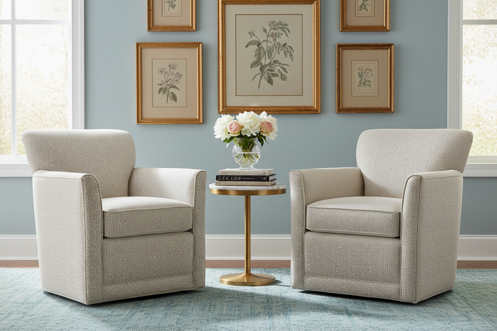 Caroline "Quick Ship" 360 Degree SWIVEL Small fabric upholstered accent chair dimensions W31" x D34" x H35". Available as shown in Wheat (100% Polyester) speckled neutral fabric with Dacron fiber wrapped seat. 360 Degree swivel chair for multiple vantage points. This premium accent chair is ready to ship and will make the perfect accent to any room.