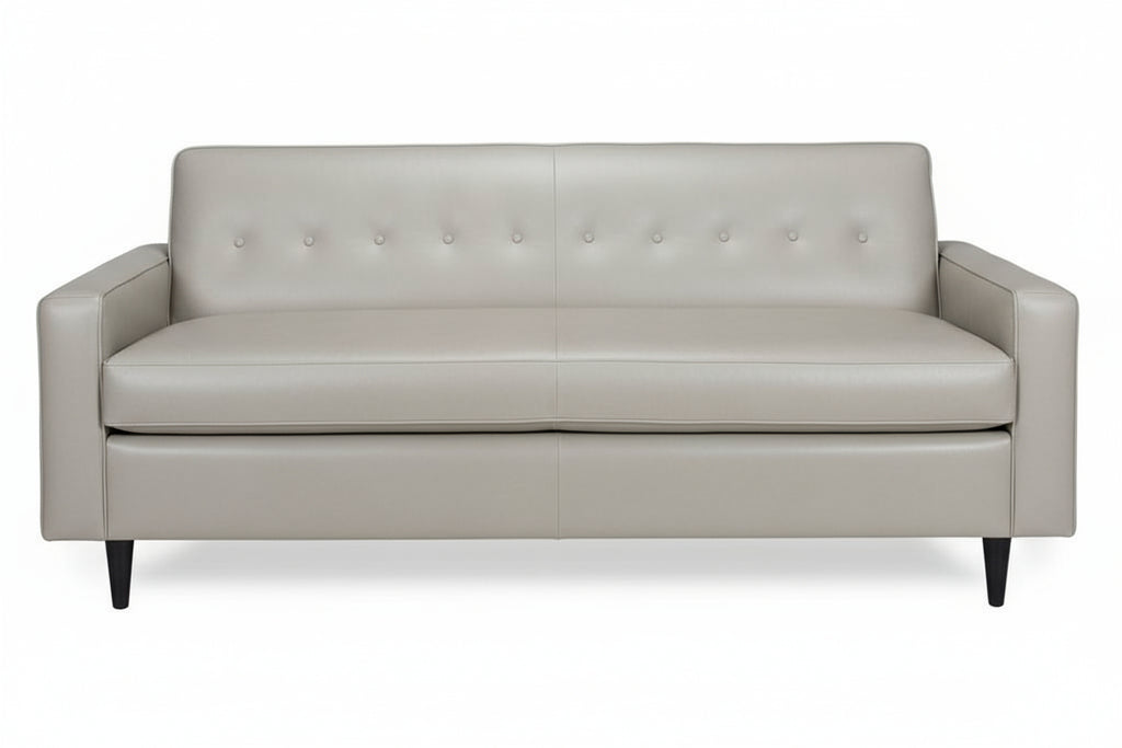 Chet Mid-Century Modern single bench seat apartment small scale leather sofa dimensions W79" x D36" x H34.5." Available in 30 distinct leather colors and 2 leg color choices.