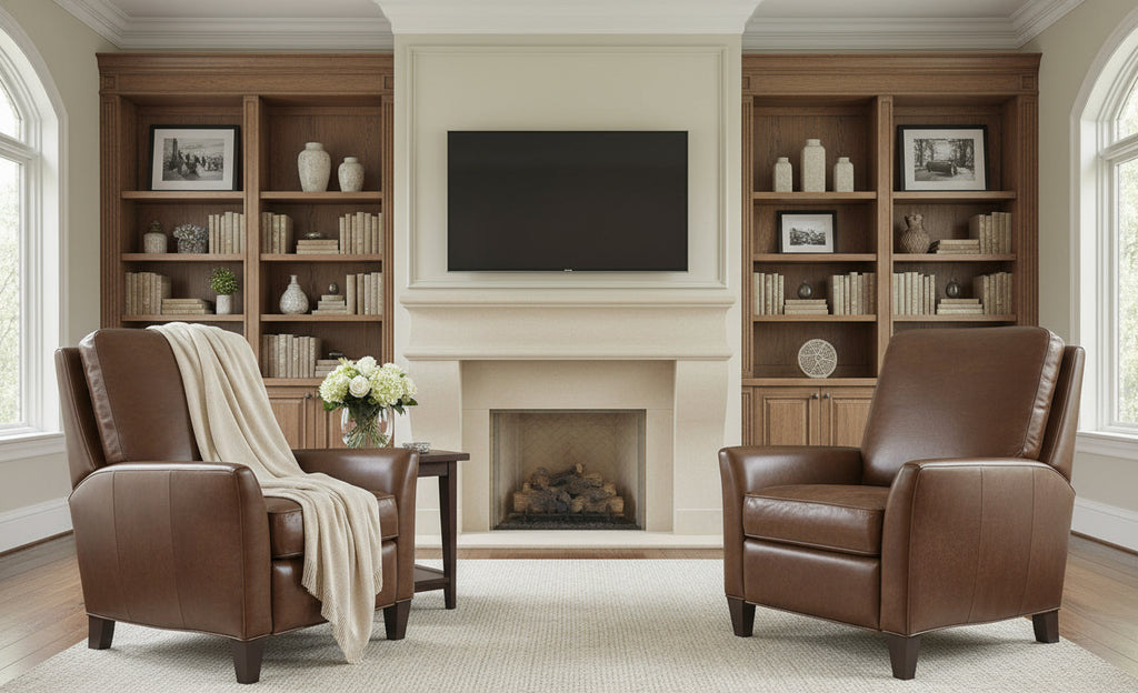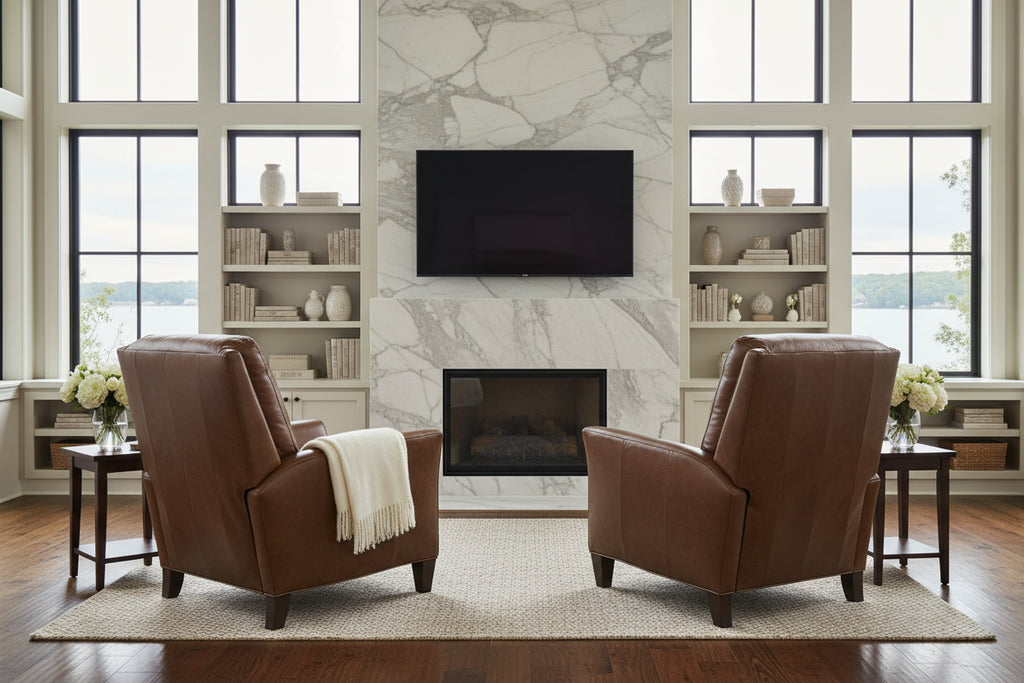 The Christian Quick Ship transitional wing arm leather reclining chair allows for maximum comfort with its limitless reclining options. This beautiful, wing-arm leather pillow back recliner is available in rich Epic Balmoral Albert leather with Chestnut leg color and flair out arms . This ready to ship transitional leather recliner is ideal for any spacein your home. Hand-crafted comfort,transitional design, and plush fiber wrapped seating make the Christian Wing Arm recliner one you can’t pass up.