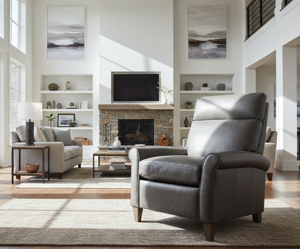 The Dennison "Quick Ship" POWER transitional leather reclining chair measures W32" x D36" x H39" and features a rechargeable battery for electric power controlled reclining positions, including TV and fully reclined. No need for an unsightly cord extending to your recliner, Dennison features a rechargeable battery pack that simply slides under the recliner for a months worth of activity. Depth when fully reclined is 66." This beautiful rolled arm leather recliner is available in rich Luxe Milestone Smoke leather with Bombay (coffee bean) leg color and features a down/feather wrapped seat cushion (all pictured). This ready to ship leather club chair recliner is ideal for any room in your home and features hand-crafted comfort and a plush bustle back design.