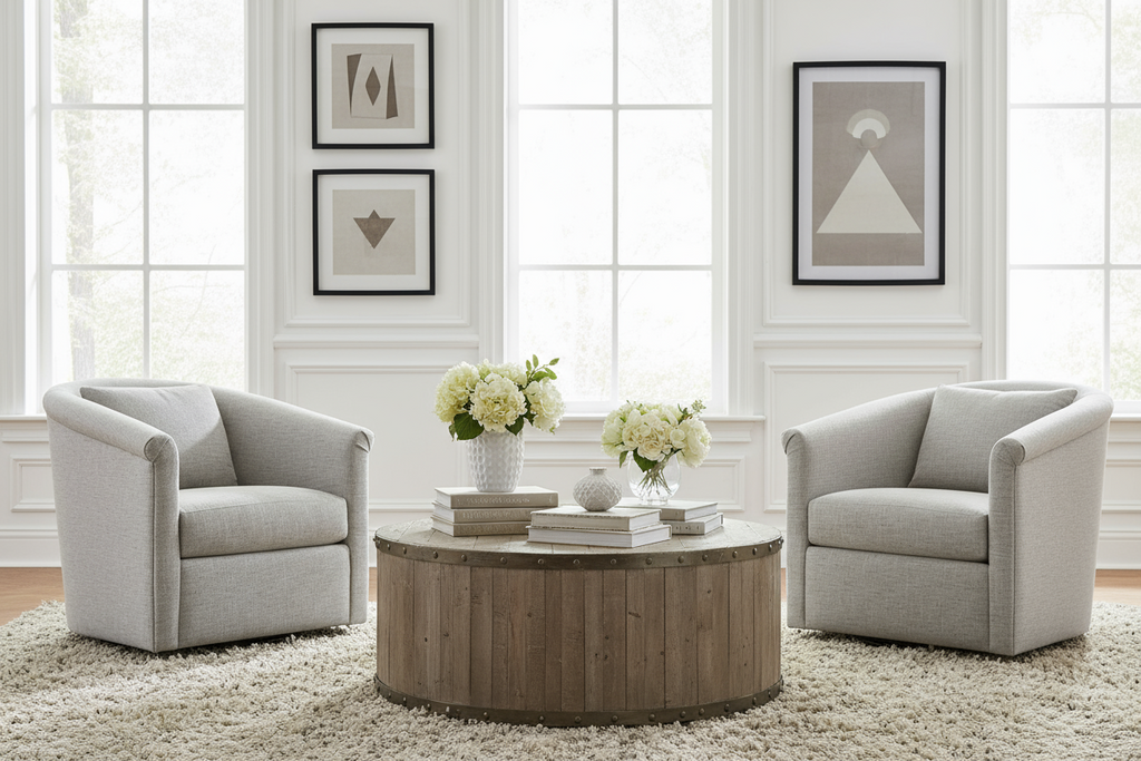 The Desiree fabric tub chair is small scale, comfortable, contemporary, stylish and extremely well-made. This swivel accent chair is perfect for creating the ultimate cozy seating area in a living room or den. This delightful tub chair has a pleasing curved design signaling the ultimate spot to curl up and read a book. A plush seat cushion and no-sag springs ensure support and comfort for years. This chair swivels a full 360 degrees, so the occupant can follow conversations around the room. This handcrafted custom tub chairs is available in 100 premium fabrics, from durable brushed canvas to luxurious Euro velvet. You are sure to find the perfect color and material to complete your home.