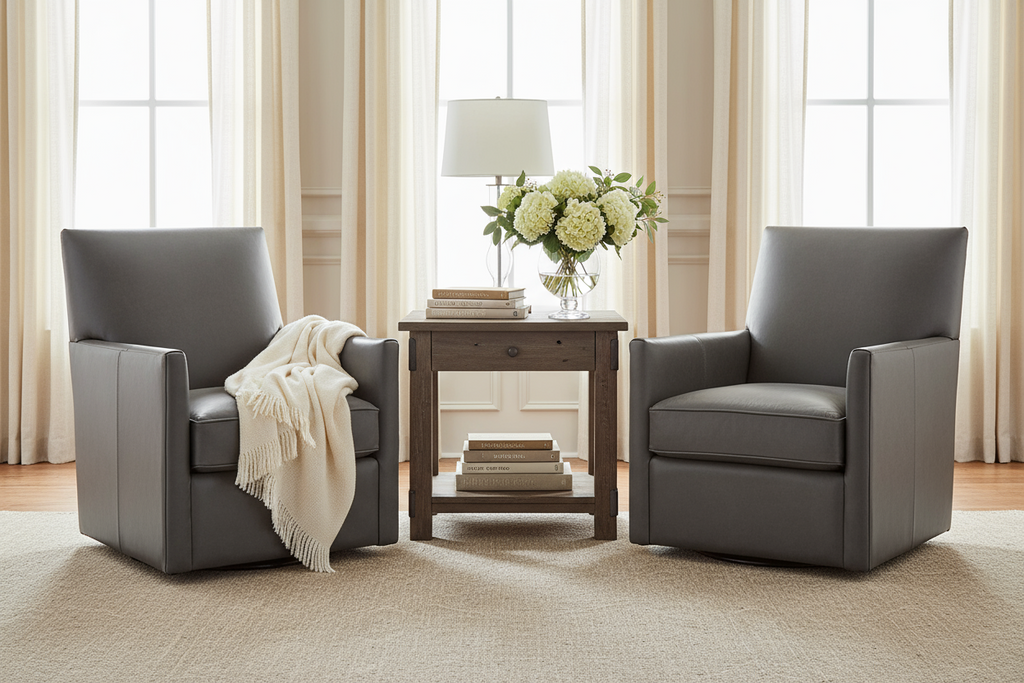 Behold Pearson, embrace this 360 degree SWIVEL classic tight-back leather chair to bring timeless beauty into your home. The warm "Luxe Royalton Gray" upholstery is elegant, welcoming and versatile to match your living room décor, while the chair's striking track arms add a sleek and refined touch.