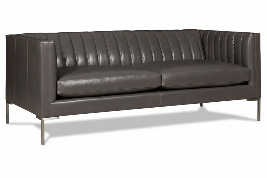 Dolan modern apartment small scale leather sofa dimensions W76.5" x D36.5" x H30." Available in 30 distinct leather colors and exposed metal stainless steel legs.