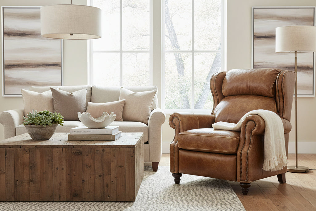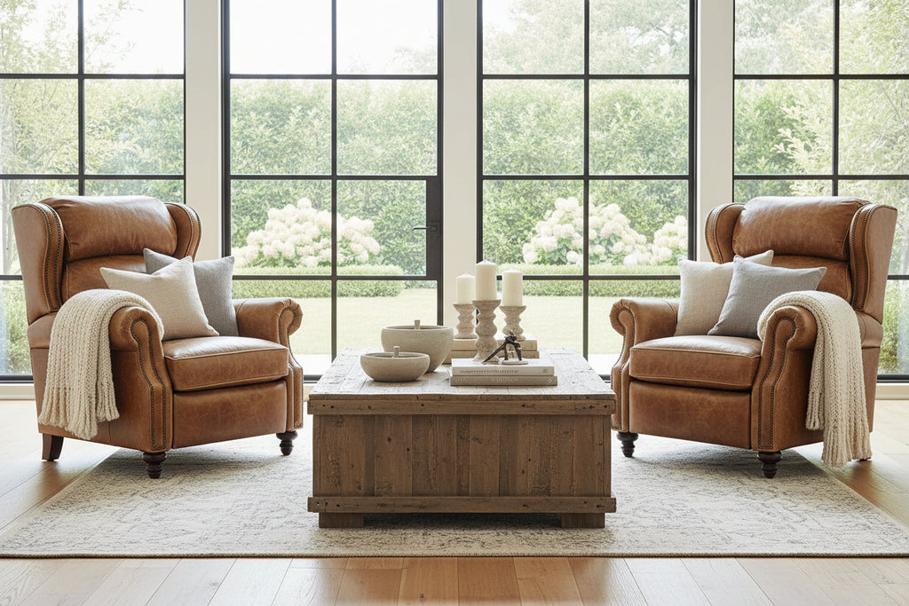 Introducing The Douglas "BIG MAN" recliner measuring W38" x D40" x H45" Indulge in luxurious comfort with this handcrafted wingback recliner, made with precision in North Carolina. Designed for both sophistication and relaxation, this elegant chair features a plush bustle back, offering superior neck and lumbar support. The refined wingback silhouette, rolled arms, and hand-applied nailhead trim exude timeless charm, making it a standout piece in any living space. Expertly crafted from a solid hardwood frame and upholstered in your choice of 40 premium leather colors, this recliner seamlessly blends durability with personalized style. Its smooth reclining mechanism ensures the perfect lounging experience. Elevate your home with heirloom-quality craftsmanship and the ultimate in comfort and elegance—tailor-made just for you. This beautiful leather recliner is available in 40 distinct leather colors and 2 leg color choices.