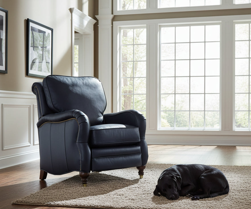 Classic and timeless Charles of London styled leather recliner. Enjoy the comfort and sophistication of the Edmund leather reclining chair. Features multiple reclining positions to always keep you comfortable. Our favorite reclining positions in the Edmund Leather Recliner are the TV/Reading position and napping in the fully reclined. When fully reclined, this traditional leather recliner has an amazing depth of 69". This beautiful leather recliner is available in 40 distinct leather colors and 2 leg color choices.