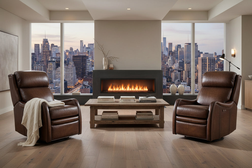 The Fairmont SWIVEL Power "Quick Ship" transitional electric leather recliner chair measures W28" x D41" x H41" and features unlimited reclining positions, including TV and fully reclined. Depth when fully reclined is 68." This elegant, transitional leather wing-back style recliner is available in rich 100% top grain Epic Brindisi San Marco leather (as shown) with vintage welting and Swivel / Glider functionality (all pictured). This ready to ship leather swivel / glider club chair recliner features power recline functionality where you can adjust the amount of recline. The perfect seating position is at your finger tips, reading, watching TV or taking a nap you choose which power controlled adjustment is best for you. Transitional design, hand-crafted comfort and plush fiber wrapped seating.