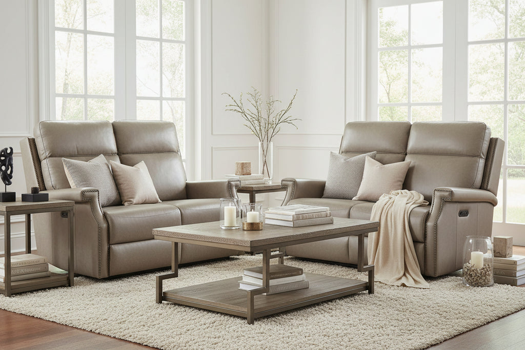 Make this unique reclining modern leather loveseat yours today... get low monthly payments when you finance it during checkout with Affirm! The traditional zero gravity loveseat re-defined. The Galina leather Quick Ship traditional leather recliner loveseat features set back squared off track arms, hand applied accent nails and ultra plush seating area. Upholstered in 100% top grain Epic Shattered Stone leather. This dual powered loveseat features a plush fiber wrapped tight seat, inviting power amenities for adjustable support and is only available in rich 100% leather (as shown) with electric power recline and adjustable headrest (all pictured). Each side is independently controlled to adjust recline and headrest. This ready to zero gravity loveseat is ideal for any room in your home where relaxation, style and comfort are a must. Distinctive styling, hand-crafted comfort and ultra-plush power recline and headrest define the traditional Galina loveseat.