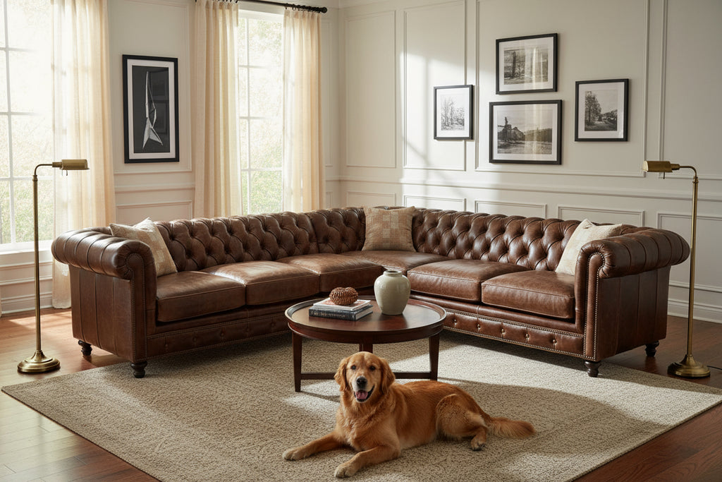 Having a sectional that perfectly fits in your space not only makes the space more functional it also makes it more stylish. The Galloway chesterfield style tufted leather sectional is the best of both worlds when it comes to versatility and style. This low-profile leather couch features antique brass nailhead trim, a fully attached back cushion and a zippered, removable seat cushion. Choose from 30 fantastic leather colors, 2 wood leg colors, and 9 sectional pieces to completely customize this chesterfield leather sectional to meet your needs. Made with 100 percent top grain, aniline dyed leather atop our signature select kiln dried hardwood frame, this low-profile leather couch, is beautiful and incredibly durable.