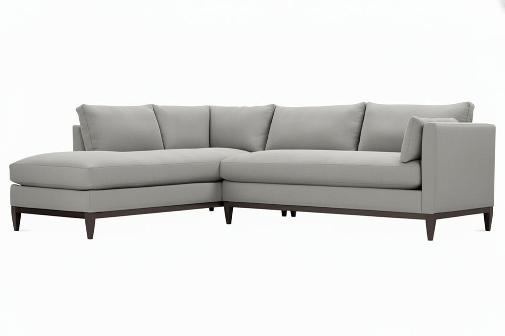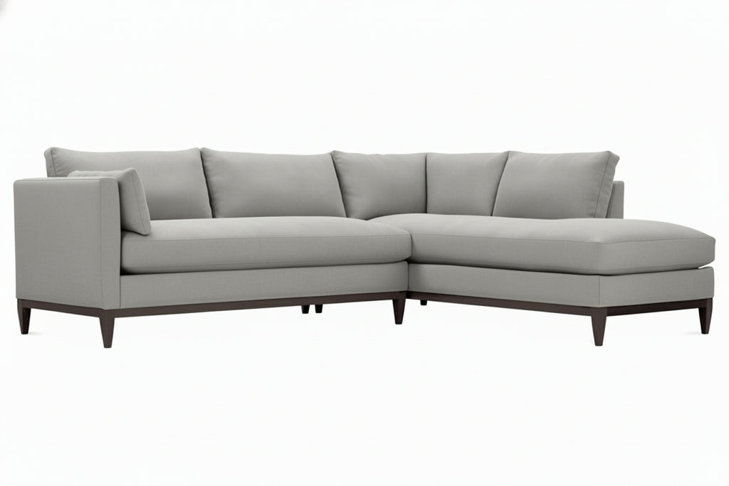 This contemporary fabric sectional sofa is big on style (available in 100 designer fabrics), design (check out the exposed wooden rail system and legs, French top stitched pillow back and seats, and clean lines) and flexibility (different seating combinations). With Georgia, you receive a left or right facing loveseat and a left or right facing chaise bumper as photographed (version 1 or version 2). For everyday relaxing and kicking back, the chaise bumper is a perfect addition to your open space. For entertaining a group or just relaxing, maximize your style and seating options with this amazing sectional combination. Club Furniture is always in anticipation of what will support a fabulous life.