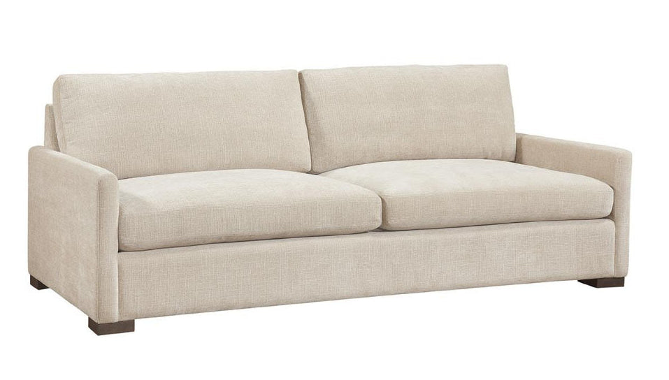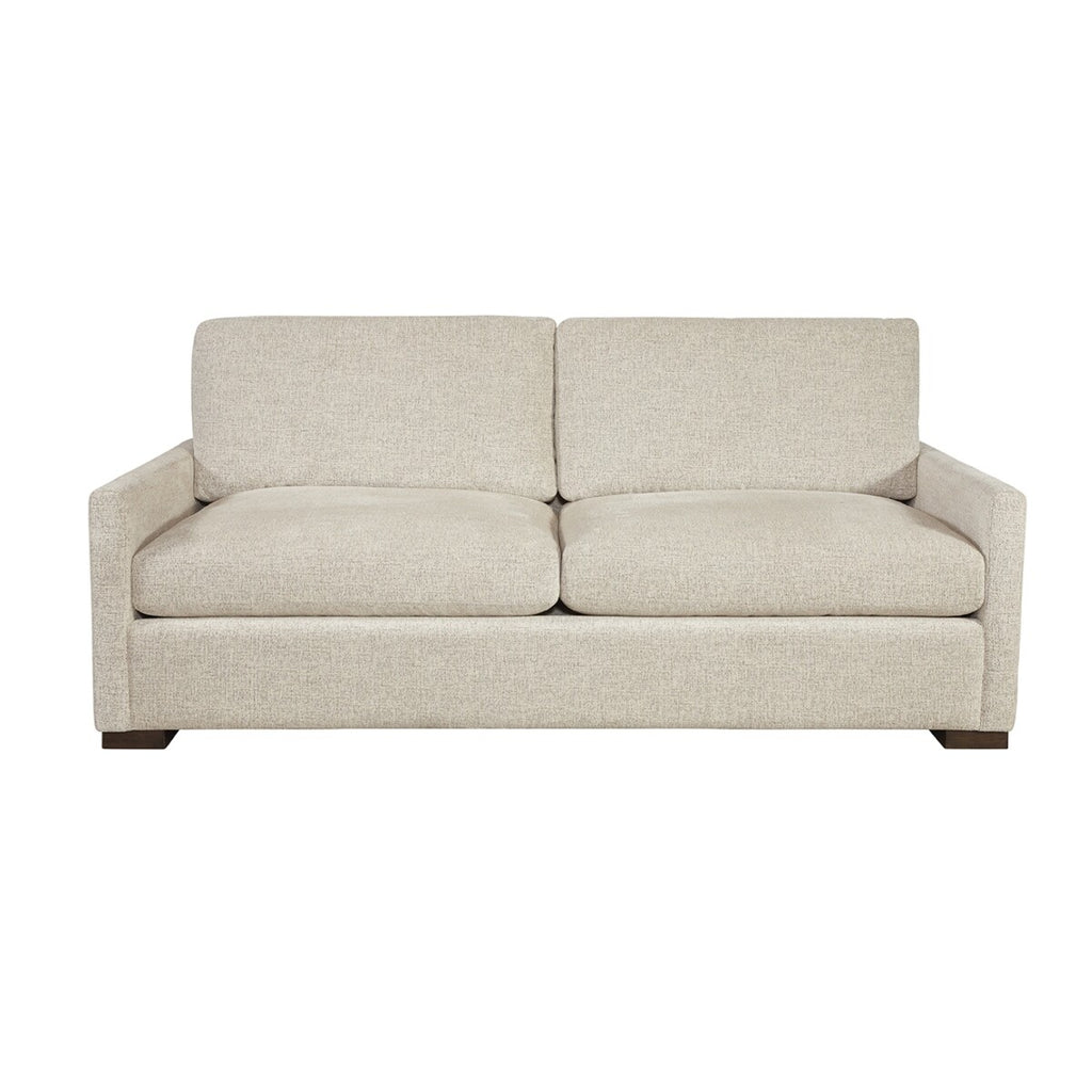 The Grady studio apartment size fabric upholstered sofa dimensions W81" x D42" x H37". Available as shown in Metro Plushtone Linen 100% Polyester performance (kid and pet friendly) fabric, down/feather wrapped seat cushions with an 8-way hand tied spring system. Solid hardwood frame construction with rich exposed Bombay espresso wooden legs. The price shown includes the Down/Feather package.The Sadie 81-inch apartment sofa brings luxury comfort to larger living spaces. Built with kiln-dried hardwood for lasting durability and supported by 8-way hand-tied springs, this deep-seat design offers exceptional support and longevity. Wrapped in plush down feathers, the seating delivers cloud-like comfort perfect for relaxation. Ideal for smaller living spaces, the Grady combines quality craftsmanship with big proportions, making it the smart choice for stylish, comfortable living without compromise.