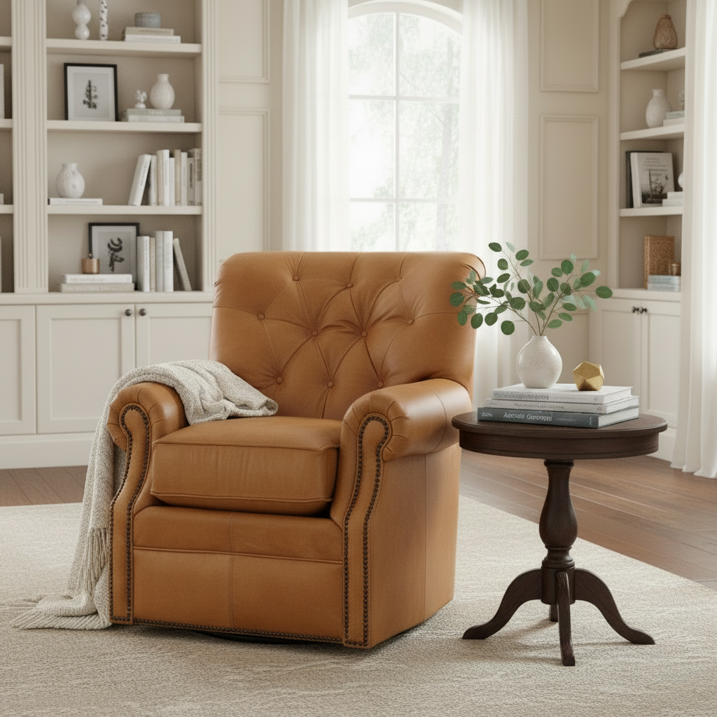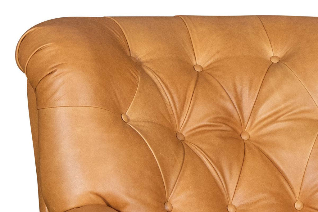 The Irving leather button tufted swivel chair measures W34" x D39" x H40" and is available in 40 top grain leather colors! This style features classic tufted club chair styling, unique inset arms and a plush seat cushion. Vintage hand applied antique brass or antique pewter nail accents and 360 degree swivel capabilities finish out the look.
