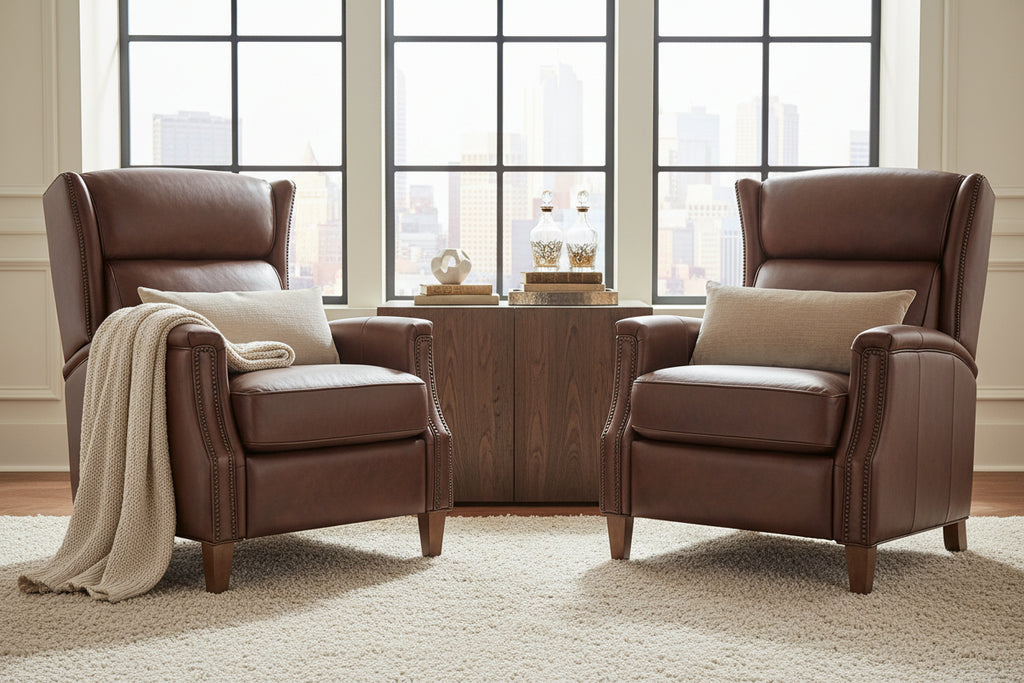 The Isaac Cognac Dual Power "Quick Ship" transitional electric leather recliner chair measures W32" x D39" x H42" and features multiple reclining positions, including TV and fully reclined. Depth when fully reclined is 69." This elegant, transitional leather wing-back style recliner is available in rich 100% top grain Epic Enna Cognac leather (as shown) with Chestnut (Medium Brown) leg color (all pictured). This ready to ship leather club chair recliner features dual stage functionality where you can adjust the amount of recline and independently control the headrest angle as well. The perfect seating position is at your finger tips, reading, watching TV or taking a nap you choose which power controlled adjustment is best for you. If you like to read electronic devises while you relax there is a USB port for charging as well. Transitional design, hand-crafted comfort and plush fiber wrapped seating.