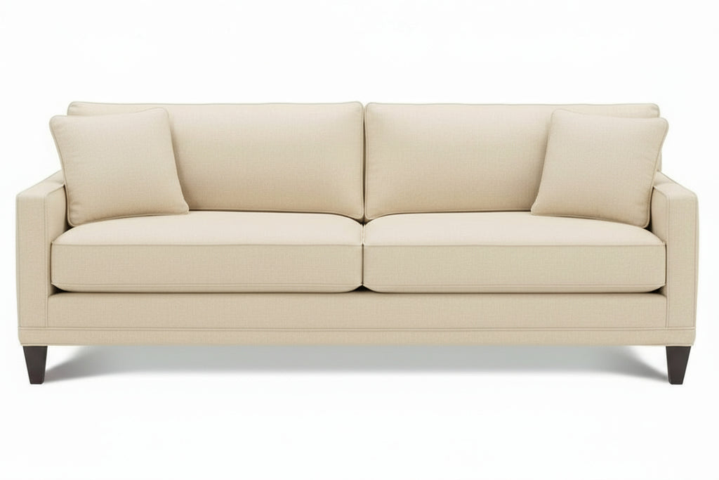 No need to put your life on hold with our transitional sofa, Janice. A queen sleeper that's ready to go when you are, Janice is suited to small spaces and interesting places. Small enough, in fact, that you can probably throw it into the back of a truck or van and take on the road with you. The innerspring mattress is a lot more comfortable than sleeping on a friend's floor. Or if you're a real bon vivant, opt for the comfy Cloud Contour® memory-foam mattress that will have them coming back for more. But let's not get ahead of ourselves. Janice is a two-cushion, track-arm, apartment-sized sleeper sofa. The kiln-dried hardwood frame is made in the U.S. Customize the fabric upholstery to your personal taste with a selection of 100 premium swatches; one is sure to rev your motor. Janice's long tapered legs are also customizable with a choice of Bombay or chestnut stain. Don't let a case of wanderlust or indecision stand between you and Janice's contemporary styling and track arms. This is a transitional apartment size queen sleeper sofa that can grow old along with you.