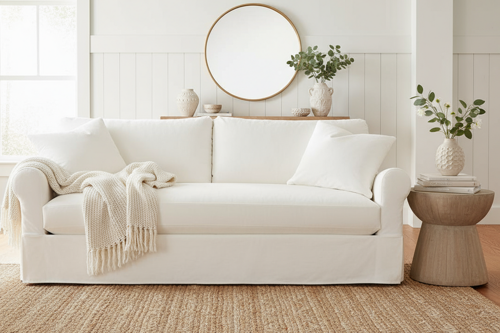 Classic rolled arms define our handcrafted Kaley I 94 Inch Single Seat Bench Fabric Slipcovered Sofa with Skirted Base and ultra plush cushion package, available exclusively from ClubFurniture.com. Make it uniquely yours by selecting the fabric, colors, seat type and throw pillows from our premium collections. Our custom slipcovered sofas are crafted at our North Carolina facilities from select kiln-dried hardwood frames and no-sag steel tempered springs to create the most durable, high-quality base for our furniture. The fully removable slipcover on this skirted sofa is for your convenience. Compare our workmanship and prices. You can find somewhat similar sofas at leading furniture stores, but not with our custom frame-to-fabric quality and certainly not at our famously affordable prices. Shop our online showroom with confidence, knowing your purchase is backed by our renowned craftsmanship, guarantees and 30-day in-home trial to ensure your satisfaction. We invite you to consult our furniture experts for guidance. Revisit ClubFurniture.com throughout the year for our popular sales and home furniture introductions.