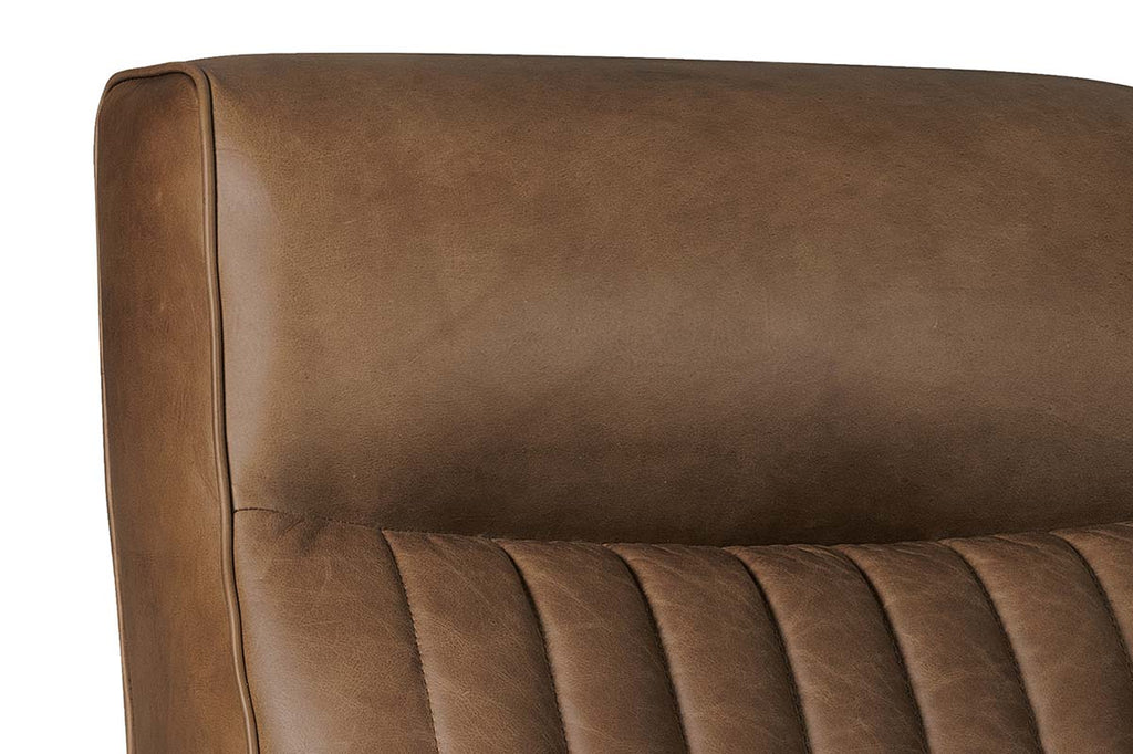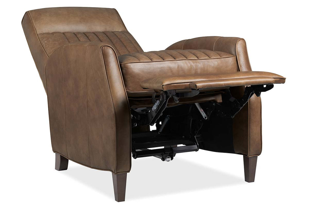 The Kirby Bourbon "Quick Ship" transitional leather recliner chair measures W29" x D39" x H42" and features multiple reclining positions, including TV and fully reclined, push back manual activated. Depth when fully reclined is 68." This elegant, transitional leather recliner features a channeled bustle back and is available in rich 100% top grain Epic Chester Bourbon leather (as shown) with Chestnut leg color. The seat cushion features a high resilient, high density foam core wrapped with virgin polyester fibers, assuring luxurious comfort and pleasing crown appearance. This is then covered with a special ticking for pillow soft comfort. (all pictured). This ready to ship leather club chair recliner is ideal for any room in your home. Transitional design, smaller scale, hand-crafted comfort and plush fiber wrapped seating.