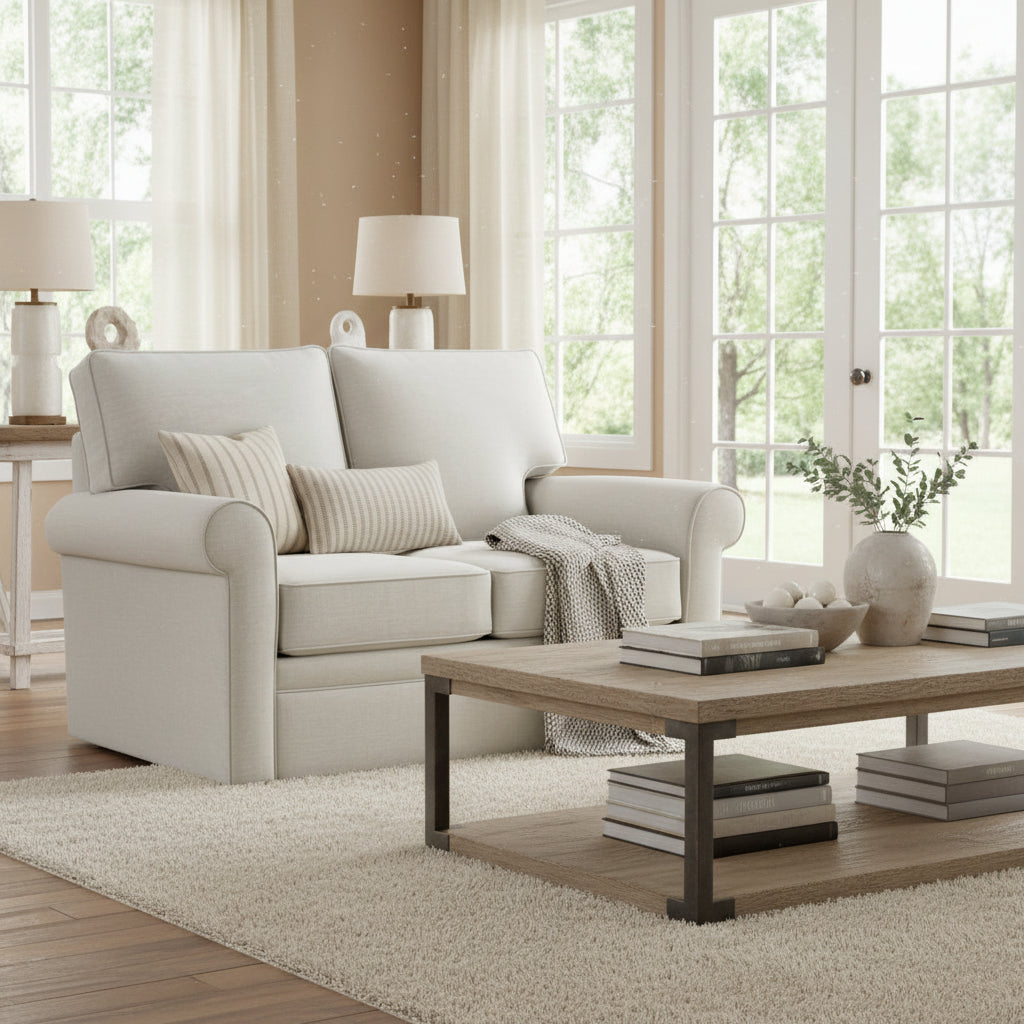 Designed to complement a large sofa layout or provide space-fitting seating in smaller rooms, this Kyle loveseat is 63 inches wide, 40 inches deep and 3 feet high. In addition to colors and fabrics, choose polyfiber-wrapped or luxurious down feather-wrapped seat cushion cores. The two back cushions and two seat cushions are zippered and removable. The seat height is 21 inches, and the arm height is 25 inches. Our guaranteed no-sag springs are engineered with a tempered steel continuous wire spring system. Browse our coordinating Kyle sofas, sleepers, upholstered chairs and ottomans.