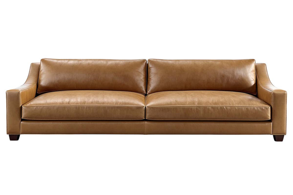 The Lars track arm pillow back leather sofa measures W96" x D44" x H32" and features a sturdy 8-way hand tied suspension, solid maple hardwood frame, high quality leather upholstery, and decorative exposed block legs. French top stitched seams give the frame, seat and back cushions a more updated look and feel. It is available in 40 distinct leather colors, 2 exposed wooden leg color options.