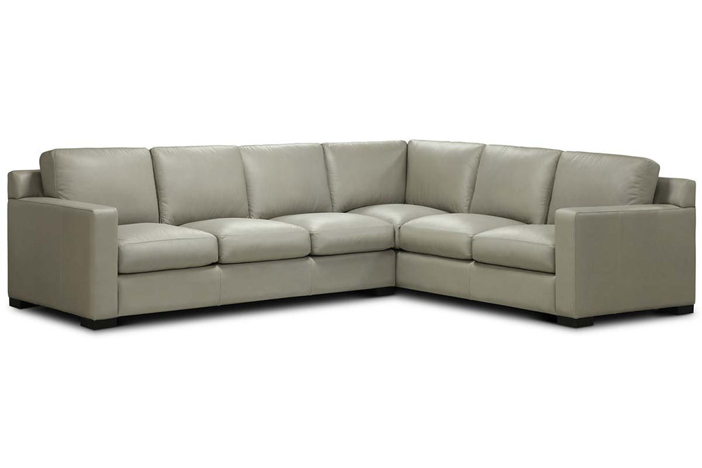 Version 1 of the Lawrence transitional leather two-piece sectional sofa features padded track arms, wide plush fiber wrapped seats and loose box-border back pillows. (Total dimension as shown in photograph W122" x W97" x H35"). This transitional sectional is comprised of a Left Facing Sofa W82" x D40" x H35" and a Right Facing Corner Sofa W97" x D40" x H35". This transitional leather sectional couch is ideal for any room in your home and is available in 40 premium 100% top grain leather options with your choice of decorative Chestnut (Medium Brown) or Bombay (Coffee Bean) exposed wooden legs. Transitional styling, luxurious comfort and solid hardwood construction define this well appointed leather sectional.