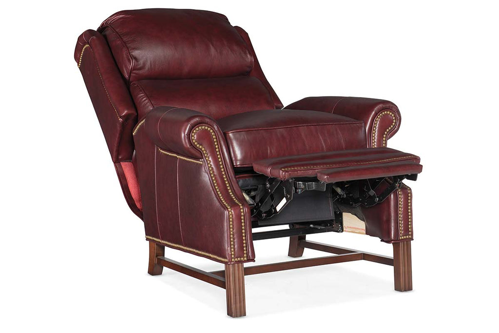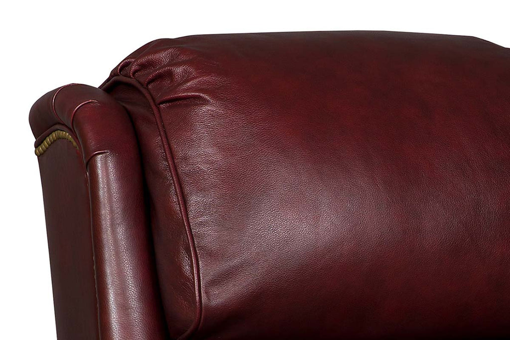 MADE IN THE USA! The Leo Burgundy "Quick Ship" traditional leather reclining chair measures W36.5" x D40" x H46" and features multiple reclining positions, including TV and fully reclined. Depth when fully reclined is 72". This beautiful, traditional leather bustle pillow back recliner is available in Epic Burgundy top grain leather (As Pictured) with decorative Chestnut brown Mission style exposed wooden base with fluted front legs and hand applied Old Brass accent nails (all pictured). The Spring Down-Cushion consists of a 4 1/2 inch MARSHALL coil unit encased in premium foam. The cushion is then wrapped with a low melt fiber on top and bottom. The Spring Down cushion is then surrounded by a down-proof ticking filled with a luxurious blend of down, feathers and fibers. This cushion is designed to provide superior comfort combined with great resiliency.This ready to ship leather recliner is ideal for any room in your home. Traditional design, hand-crafted in North Carolina comfort and plush down / feather wrapped seating.