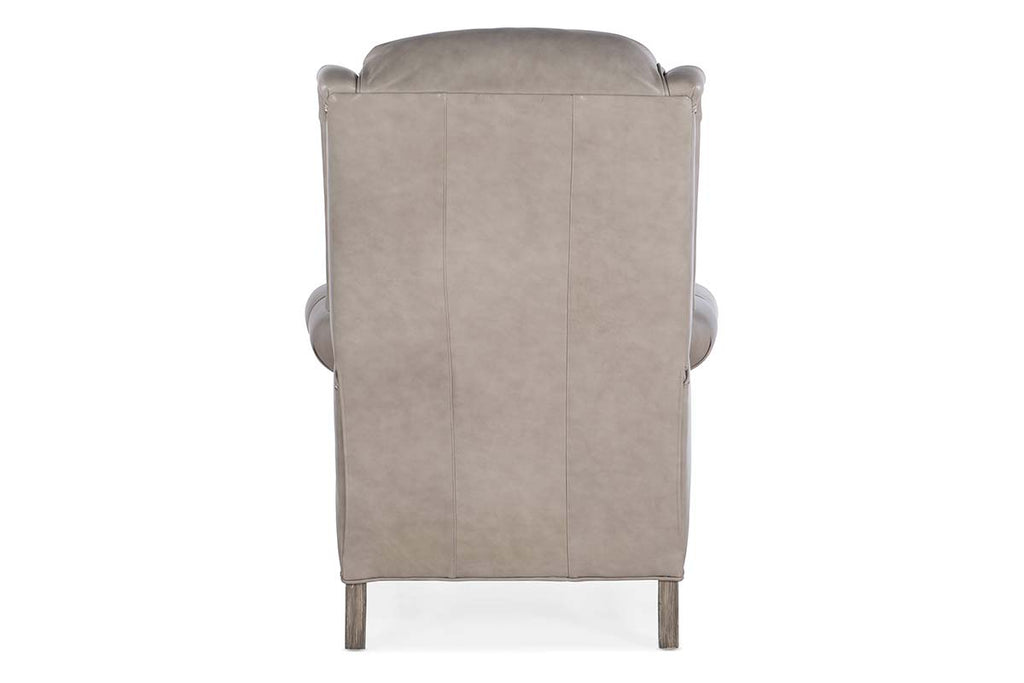 MADE IN THE USA! The Leo Stone "Quick Ship" traditional leather reclining chair measures W36.5" x D40" x H46" and features multiple reclining positions, including TV and fully reclined. Depth when fully reclined is 72". This beautiful, traditional leather bustle pillow back recliner is available in Epic Stone top grain leather (As Pictured) with decorative Grey Wash Mission style exposed wooden base with fluted front legs and hand applied Pewter accent nails (all pictured). The Spring Down-Cushion consists of a 4 1/2 inch MARSHALL coil unit encased in premium foam. The cushion is then wrapped with a low melt fiber on top and bottom. The Spring Down cushion is then surrounded by a down-proof ticking filled with a luxurious blend of down, feathers and fibers. This cushion is designed to provide superior comfort combined with great resiliency.This ready to ship leather recliner is ideal for any room in your home. Traditional design, hand-crafted in North Carolina comfort and plush down / feather wrapped seating.