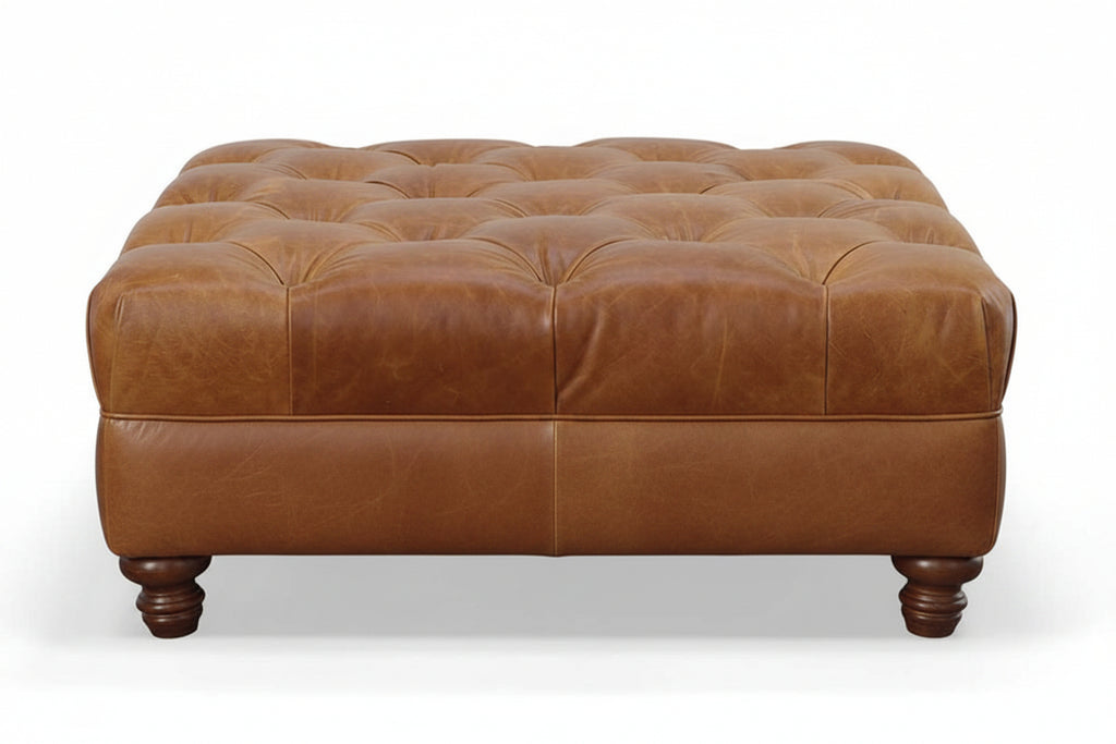 Only one available and ready for immediate shipment! Lucas "Designer Style" 44 Inch leather ottoman with inlay welting trim measures W44" x D44" x H17" Available in Coyote Tan leather and Chestnut (medium brown) leg color. Hand crafted in the furniture capital of the world, North Carolina by expert craftsman. This beautiful ottoman features decorative turned legs, inlay welt design, hand tufted top and 100% full top grain leather. Perfect for that special room where hard coffee table edges just won't do. Price shown is for 44" version.