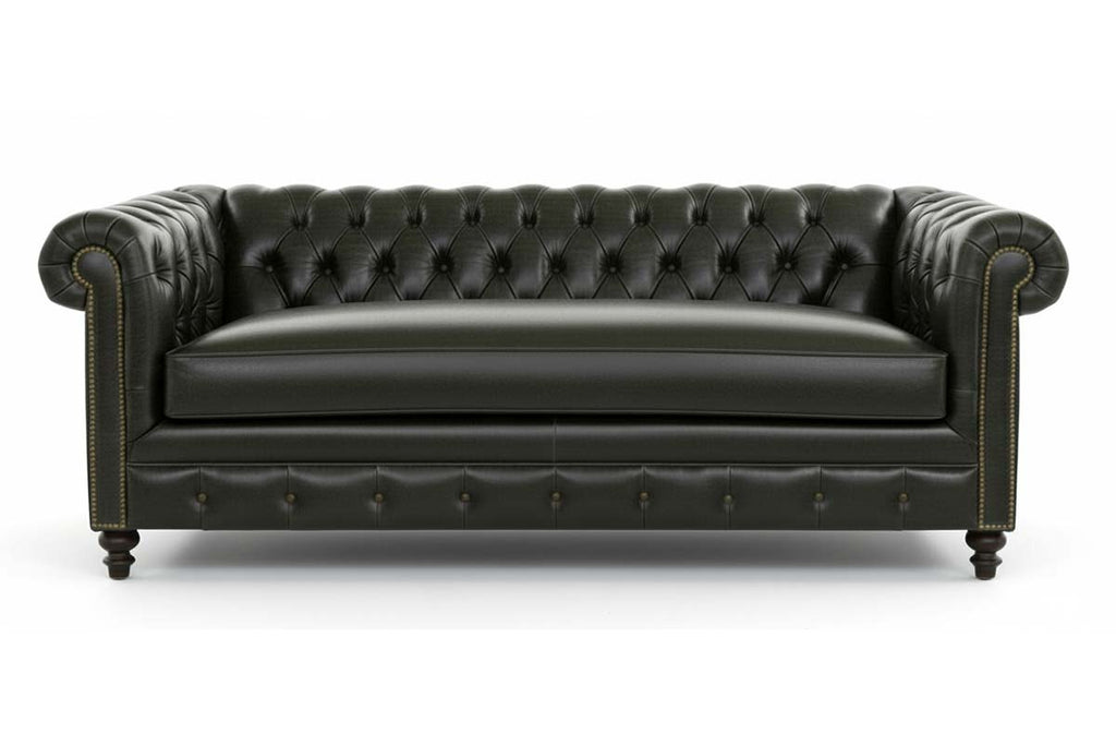 Stunning and unique, the Manchester leather sofa combines a bench seat sofa design with the beautiful and traditional accenting details of an antique Chesterfield. Hand-crafted in North Carolina, this Chesterfield leather bench sofa features a hand button tufted back and front rail, pleated arms and a bun style foot base. A decorative accent nailhead trim also outlines the arm panels and the front rail. The nailhead trim is available as pewter or in antique brass.