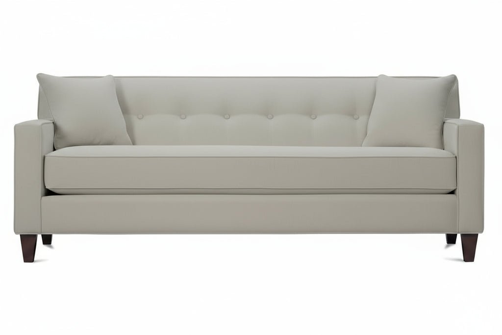 The Margo mid-century sleeper sofa has a squared shape with one long seat (bench seat) cushion and straight armrests for a boxy, modern look. At its base, pointed, thin wooden legs support the sofa and elevate it slightly off the ground. Tufted details along the back cushion add a bit of visual interest without overwhelming the piece, and two 18" accent pillows sit at either end of the sofa. The Margo sleeper sofa comes in your choice of fabric including velvet, twill, microfiber, cobble cloth or linen, and your choice of 100 bold colors as well. Even the sofa's wooden legs are customizable, with your choice of two rich stains to coordinate with your fabric choice. With so many custom options, you can make this beautiful mid-century modern sofa bed work for any room in your home.