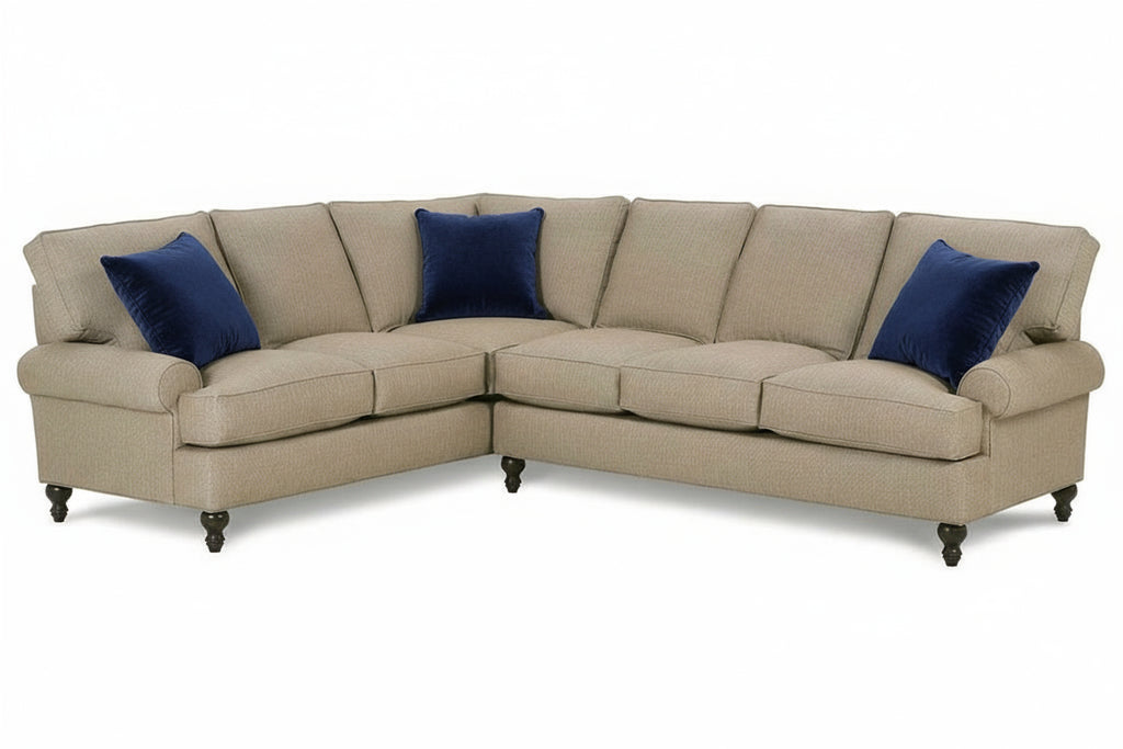 Carefully handcrafted In the United States, the upholstered sectional sofa's decorative turned leg design provides a traditional accent, while the rolled arms offer an inviting touch. The sofa also includes a standard factory warranty on the kiln-dried hardwood frames and "No Sag" sinuous springs to ensure long lasting quality. A five year Guardsmen fabric protection warranty is also available for complete coverage. This fabric sectional is a centerpiece of our showroom and is sure to be a wonderful addition to any traditionally styled home. A 30 day in-home trial is available to ensure our customers complete satisfaction of their purchase.