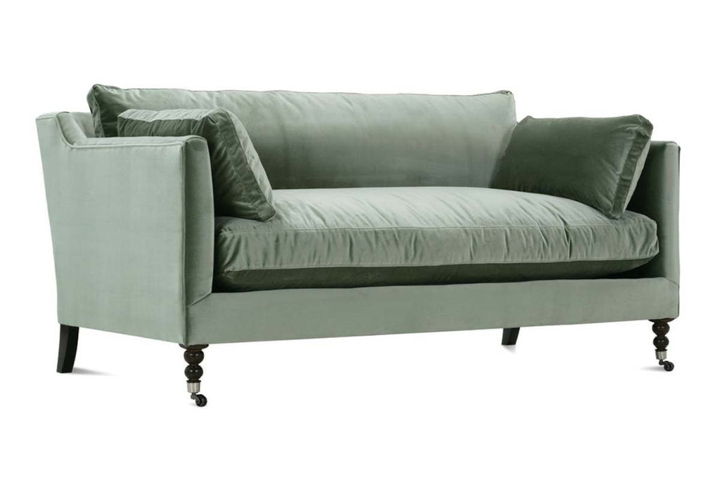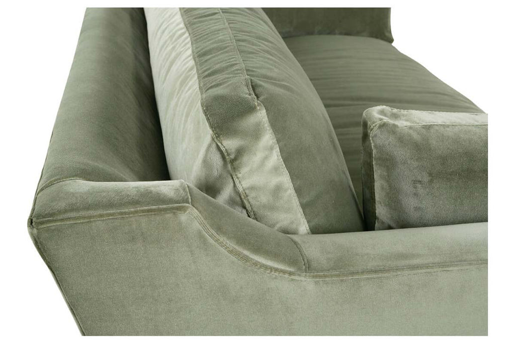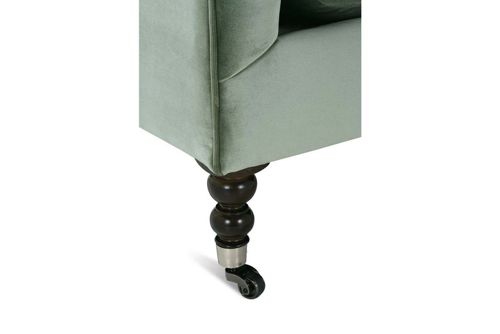 Marjorie "Quick Ship" single bench seat fabric upholstered sofa is available in Express Sage Velvet fabric and Bombay (Coffee Bean) leg finish!. Price includes FREE matching side pillows. Vintage Pewter casters are standard finish. The price shown is for Tier 3 fabric option. Usually Ships From Factory In 3-5 Days!