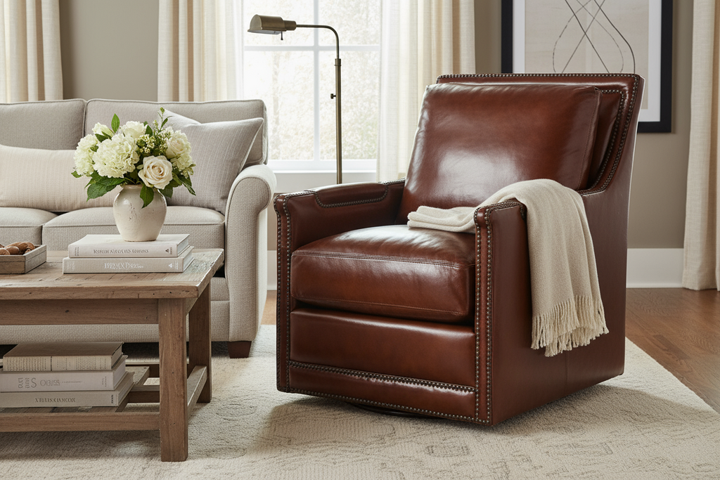 When you walk into the living room, make this traditional leather swivel accent chair the first thing you see! Covered in a gorgeous "Luxe Brooklyn Saddle" leather, this accent chair welcomes you to feel perfectly at home in your space. Take advantage of the versatile upholstery to mix and match the latest trendy accessories. No matter how many new colors and styles you bring into your living room, this chair will continue to fit right in.