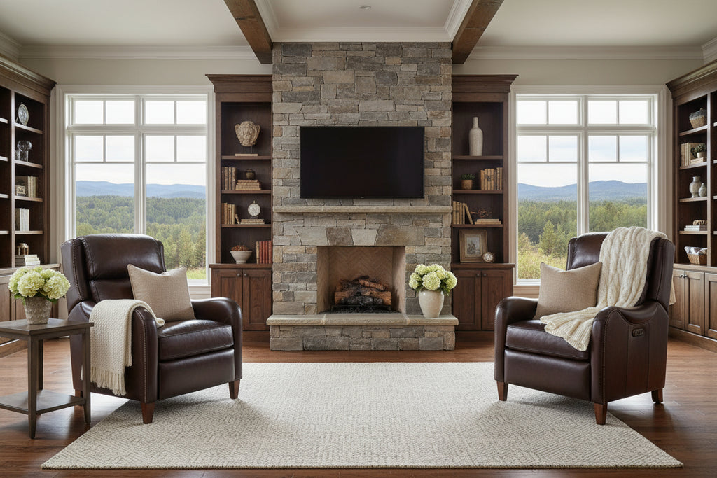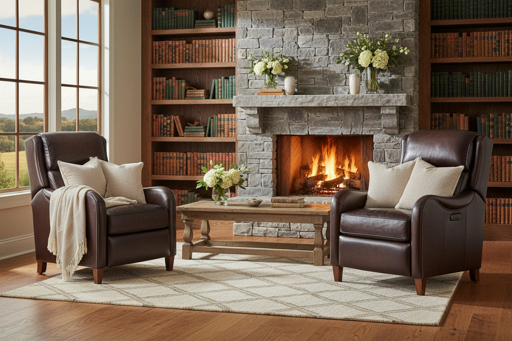 The Nate Vortex Dual Power "Quick Ship" transitional electric leather recliner chair measures W31" x D39" x H43" and features multiple reclining positions, including TV and fully reclined. Depth when fully reclined is 68." This elegant, transitional leather wing-back style recliner is available in rich 100% top grain Epic Vortex burnished hand wiped leather (as shown) with Chestnut (Medium Brown) leg color (all pictured). This ready to ship leather club chair recliner features dual stage functionality where you can adjust the amount of recline and independently control the headrest angle as well. The perfect seating position is at your finger tips, reading, watching TV or taking a nap you choose which power controlled adjustment is best for you. If you like to read electronic devises while you relax there is a USB port for charging as well. Transitional design, hand-crafted comfort and plush fiber wrapped seating.