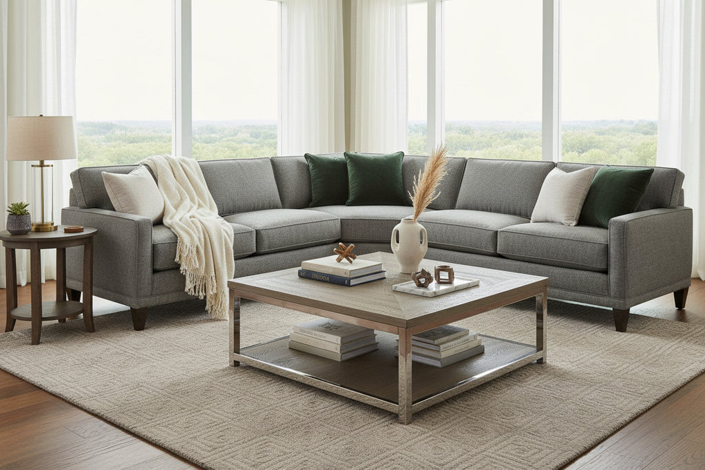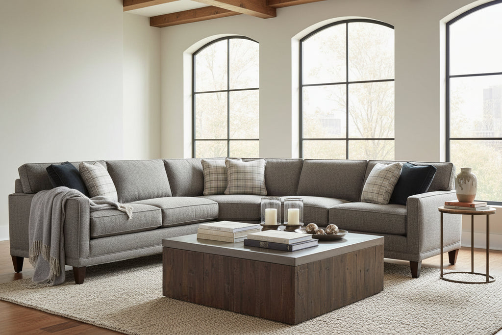With 13 configuration options, the modern style sectional sofa is perfect for any type of room. The sectional pieces also lock together. Like the Rowe Townsend sofa, this sectional with chaise uses select kiln-dried hardwood frames for added durability and support. The hardwood frames and the no-sag sinuous springs are under a standard factory warranty. Skillfully handcrafted in the United States, this upholstered sofa also features the value of factory direct, North Carolina pricing. To ensure complete customer satisfaction, we offer a 30 Day in-home trail for this elegantly modern, fabric sofa.