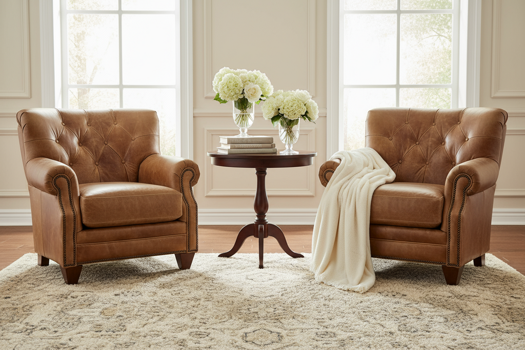 The Otis inset rolled arm traditional pulled button tight back leather accent chair features timeless design that meets handcrafted luxury in this classic leather club chair, made in the USA with meticulous attention to detail. Elevate your living space with the timeless elegance of this American-made leather accent club chair. Expertly crafted in the USA, this chair is available in 40 hand-selected premium leathers, each offering rich texture and unique character. The generously padded, fiber-wrapped seat cushion provides plush comfort, making it the perfect spot for relaxing with a good book or enjoying long conversations. Featuring classic rolled arms, hand-applied vintage nailhead trim, and a beautifully tufted back, this chair exudes refined sophistication. The sturdy hardwood frame and tailored detailing reflect heirloom-quality craftsmanship built to last for generations. Its warm, lived-in look pairs effortlessly with traditional, rustic, or transitional décor styles. Whether used as a statement piece or part of a seating arrangement, this tufted leather club chair brings luxurious comfort and timeless style to any room. An investment in both form and function, it's a stunning example of American artisan furniture. Measuring W36" x D38" x H37", this unique chair is available in multiple top grain leather colors to perfectly fit in any space. Ottoman sold separately and measures W29" x D23" x H16"