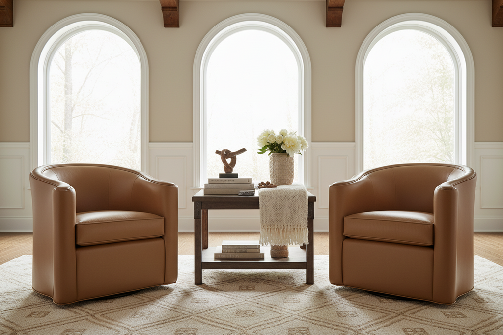 The Roman "Designer Style" contemporary swivel leather tub chair features a 360-degree swivel and sleek modern lines. This unique swivel barrel chair, available in 30 distinct top grain leather colors to perfectly fit in any space. This Swivel chair comes standard in one leather and welt color. Contrasting welt (as pictured in some photos below) is available for an additional $100 upcharge (call for details). Shop all of our leather accent chairs today!