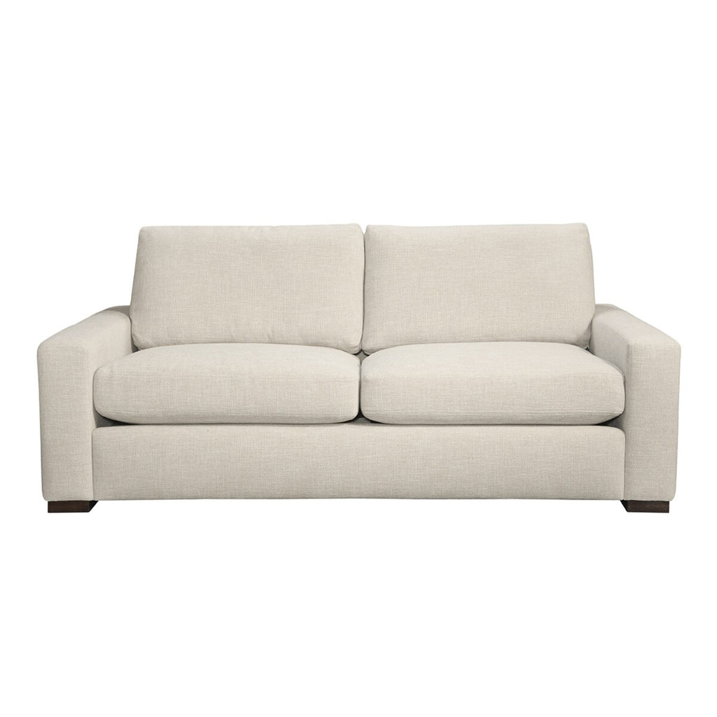 The Sadie fabric upholstered sofa dimensions W84" x D44" x H38". Available as shown in Metro Cumberland Cream 100% Polyester performance (kid and pet friendly) fabric, down/feather wrapped seat cushions with an 8-way hand tied spring system. Solid hardwood frame construction with rich exposed Bombay espresso wooden legs. The price shown includes the Down/Feather package.The Sadie 84-inch studio sofa brings luxury comfort to compact living spaces. Built with kiln-dried hardwood for lasting durability and supported by 8-way hand-tied springs, this deep-seat design offers exceptional support and longevity. Wrapped in plush down feathers, the seating delivers cloud-like comfort perfect for relaxation. Ideal for apartments and smaller rooms, the Sadie combines quality craftsmanship with space-smart proportions, making it the smart choice for stylish, comfortable living without compromise.