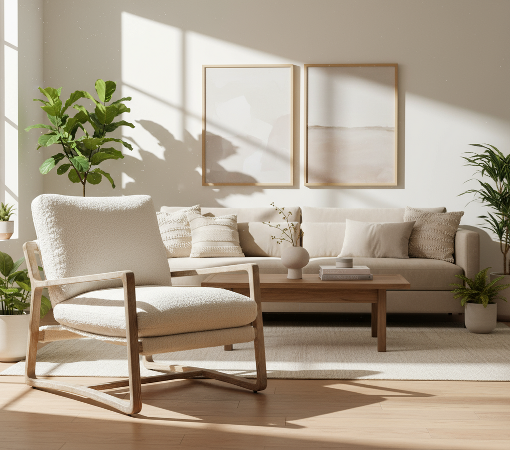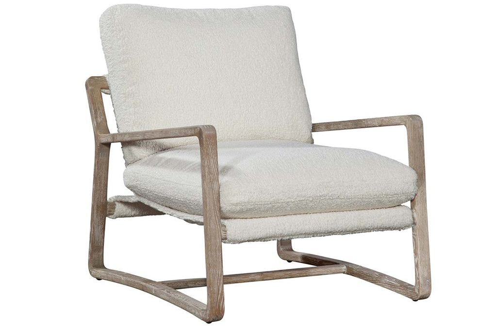The Sophia Natural "Quick Ship" modern gray washed exposed wooden upholstered accent chair measures W30" x D37 x H34" and is available in neutral plush Metro Sheepskin Natural (100% Polyester) performance fabric (pictured). Exposed natural gray washed finished hardwood arms, plush down feather wrapped seating with loose reversible border back cushion.