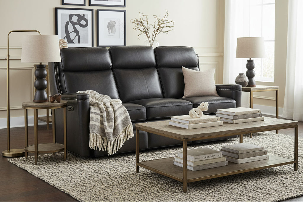 Make this unique reclining traditional leather sofa yours today... get low monthly payments when you finance it during checkout with Affirm! The Traditional zero gravity sofa re-defined. The Theron Castle 2-Way Power Quick Ship zero gravity electric leather reclining sofa measures W79" x D39" x H42". Experience luxurious comfort and refined style with the Theron Reclining Sofa. Upholstered in rich top-grain Epic Sarzana Castle leather, this piece combines classic design elements with advanced functionality. The bustle back cushions provide plush support, while the elegant nailhead trim adds a touch of timeless sophistication. Featuring zero gravity power recline, the Theron offers optimal weight distribution to reduce pressure on your back and joints, delivering a truly weightless lounging experience. The dual power headrests allow for customizable neck and head support at the touch of a button, ensuring personalized comfort. Built-in USB ports keep your devices charged and within reach, blending modern convenience with traditional elegance. Perfect for movie nights or everyday relaxation, the Theron Reclining sofa is where comfort meets .