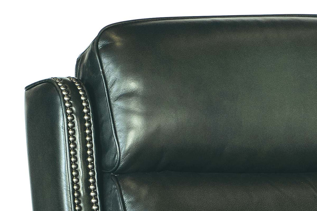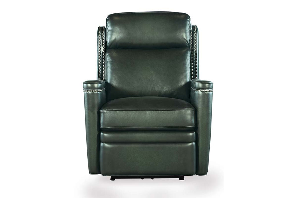 The Theron Portal Power Quick Ship zero gravity electric leather recliner chair measures W32" x D39" x H42". Experience luxurious comfort and timeless style with the Theron Recliner. Upholstered in rich, top grain Epic Sarzana Portal leather, this recliner combines modern functionality with classic design details like a bustle back silhouette and hand-applied nailhead trim. The zero gravity power recline feature promotes optimal relaxation by evenly distributing body weight and reducing pressure on joints. An integrated power headrest allows personalized neck and head support at the touch of a button, while a built-in USB port keeps your devices charged and within reach. With its smooth lines, subtly curved arms, and tailored finishes, the Theron Recliner is the perfect blend of form and function. Whether you're watching a movie, reading, or just unwinding, this recliner offers unmatched support and refined comfort for your everyday living space.