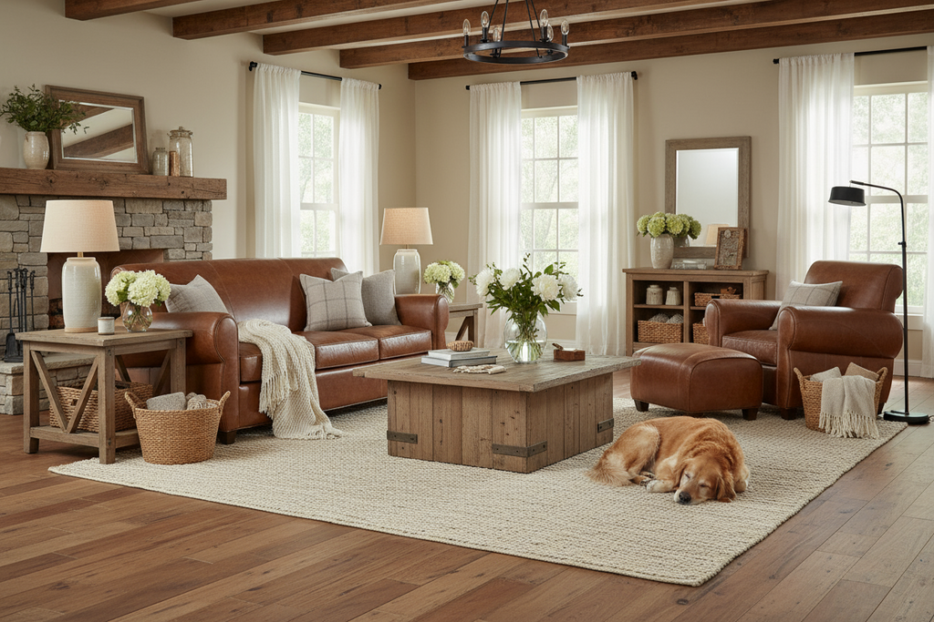 YOU SAVE $50.00! Rustic leather sofa set includes 1 leather sofa (pictured), 1 leather club chair (pictured), and 1 standard leather ottoman (pictured). See individual pieces for dimensions. Available in 30 distinct leather colors and 2 leg color choices.