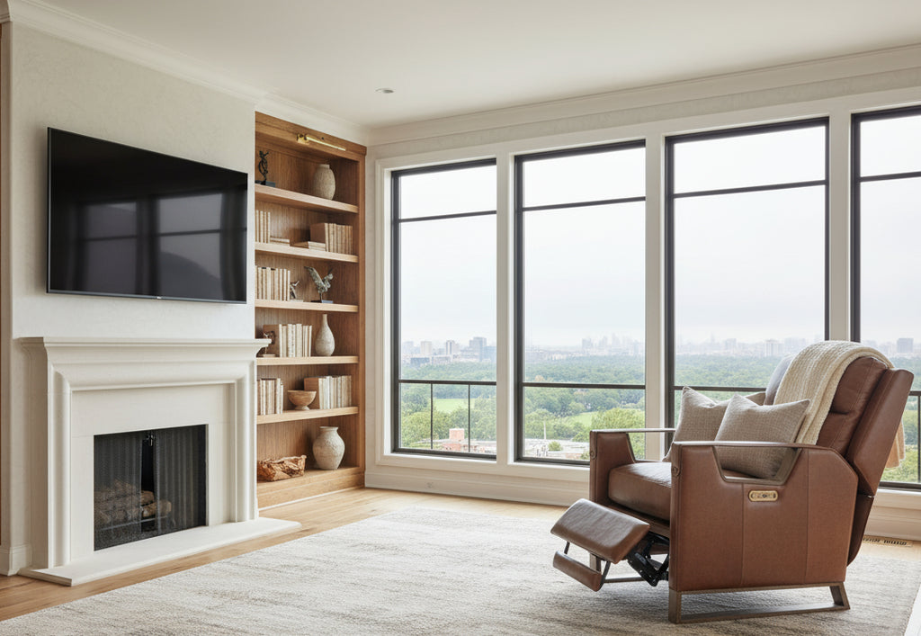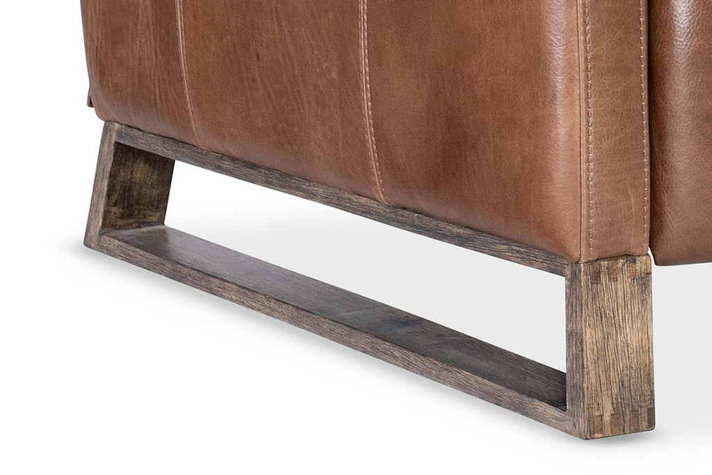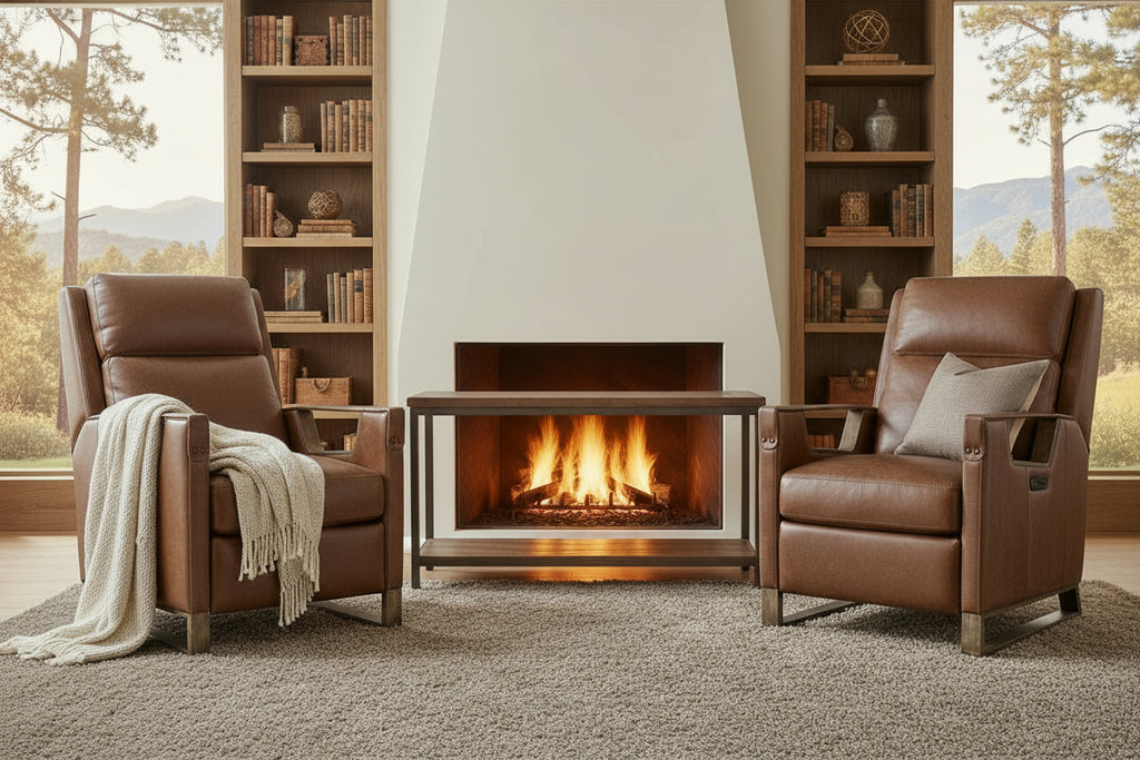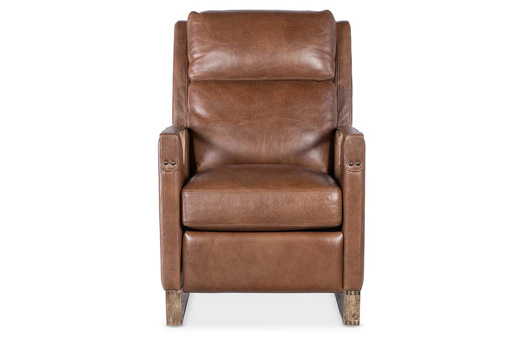 The Troy Taupe POWER "Quick Ship" Dual POWER small scale leather recliner measures W27" x D39" x H43" features multiple reclining positions, including TV and fully reclined. The Troy Recliner blends rugged charm with modern functionality for the ultimate in comfort and craftsmanship. Upholstered in rich, top-grain leather, this statement piece features power recline and a power headrest for customizable support at the touch of a button. A built-in USB port keeps your devices charged while you unwind. The distinctive wood-trimmed arms and wood sled base add rustic character and architectural appeal, perfectly complementing the Troy's sleek profile. A bustle-style back offers plush cushioning and lumbar support, while button accents on the leather strap arms add a tailored, handcrafted touch. Whether placed in a modern lodge, industrial loft, or transitional living space, the Troy Recliner is designed to stand out—while helping you sink in. Combining contemporary convenience with artisanal detail, it’s a power recliner that doesn’t compromise on style. Perfect for movie nights, reading, or simply relaxing in luxury.