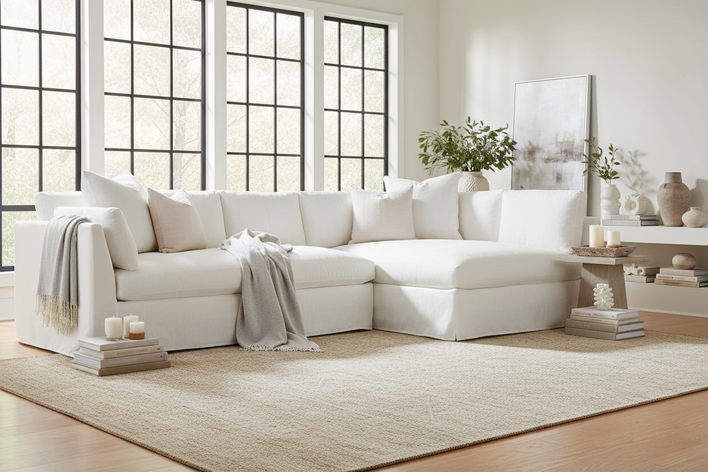 The Vanessa Two-Piece Fabric slipcovered sectional features a left-facing loveseat and a right facing large chaise bumper portion for supreme full-body relaxation. This lounging sectional couch offers an attractive silhouette with stylish track arms, oversized chaise and a single line of French top stitched pillows along the back. This sleek sectional is one of our more versatile sectional sofas, measuring 116 inches wide by 38 inches deep (loveseat) by 35 inches high. It features a 35-inch Shelter arm height and a 21-inch seat height.