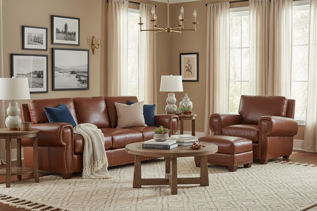 YOU SAVE $50.00! Includes 1 leather queen sleeper sofa (pictured), 1 leather club chair (pictured), and 1 matching leather ottoman (pictured). See individual pieces for dimensions. Available in 30 distinct leather colors and 2 leg color choices. Introducing the Weston Designer Style Leather Queen Sleeper Sofa Set —a masterpiece of craftsmanship custom-made in North Carolina. This sophisticated style combines luxury with functionality, featuring premium leather upholstery available in 40 stunning options to match your unique aesthetic. The striking contrasting nailhead trim adds architectural elegance and visual interest to any room. Transform your space from living area to guest bedroom effortlessly with the integrated queen sleeper mechanism. Each piece is meticulously handcrafted using only the finest materials, ensuring durability and timeless appeal. Chair features a true 8-Way hand tied spring system for long lasting durability. Whether you're entertaining guests or maximizing your home's versatility, the Weston delivers exceptional comfort and style that elevates your interior design. Experience the difference quality craftsmanship makes.