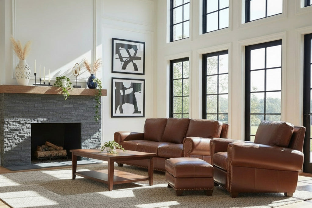 YOU SAVE $50.00! Includes 1 leather sofa (pictured), 1 leather chair (pictured), and 1 matching leather ottoman (pictured). The Weston "Designer Style" Leather Sofa Set represents the pinnacle of American craftsmanship, meticulously handcrafted in North Carolina using only the finest materials. Choose from 40 premium leather options to perfectly match your interior vision, then customize with elegant contrasting nailhead trim that adds sophisticated visual interest. Built to last generations, this sofa features 8-way hand-tied springs—a hallmark of luxury furniture construction that provides superior support and comfort that improves with age. Each spring is individually tied by skilled craftspeople, ensuring consistent seating that resists sagging and maintains its shape for decades. The combination of premium leather, expert hand-tying techniques, and thoughtful design details makes the Weston an investment piece that elevates any living space. Whether you're furnishing a contemporary loft or a traditional home, this versatile collection adapts to your style while delivering the comfort and durability discerning homeowners demand. Experience furniture that's built right, made local, and designed to impress. See individual pieces for dimensions. Available in 40 distinct leather colors and 2 leg color choices.